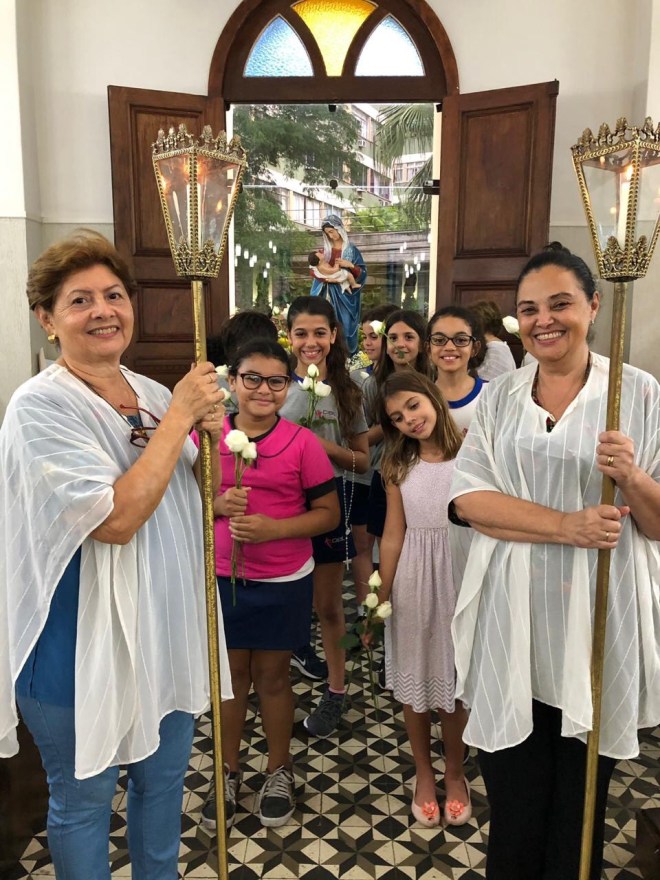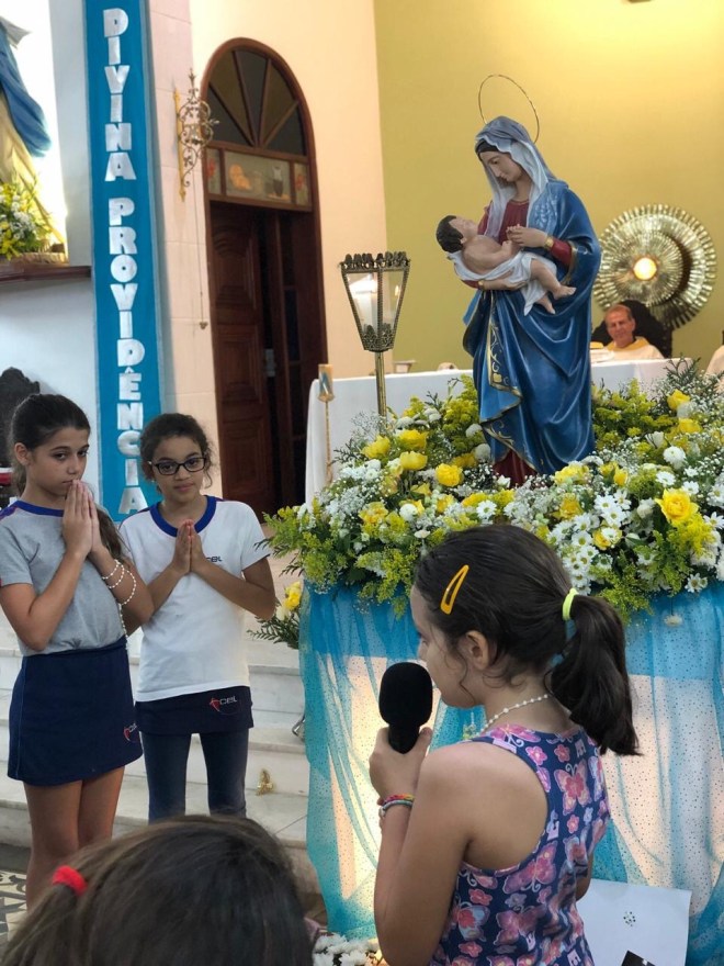 A aluna do Colégio Divina Providência, Maria Flor, cantou a música Mãezinha do Céu, acompanhada pela sua mãe ao violão e pelos alunos da Catequese da Paróquia Nossa Senhora da Divina Providência.