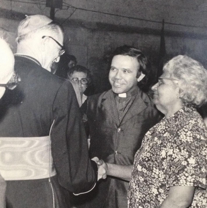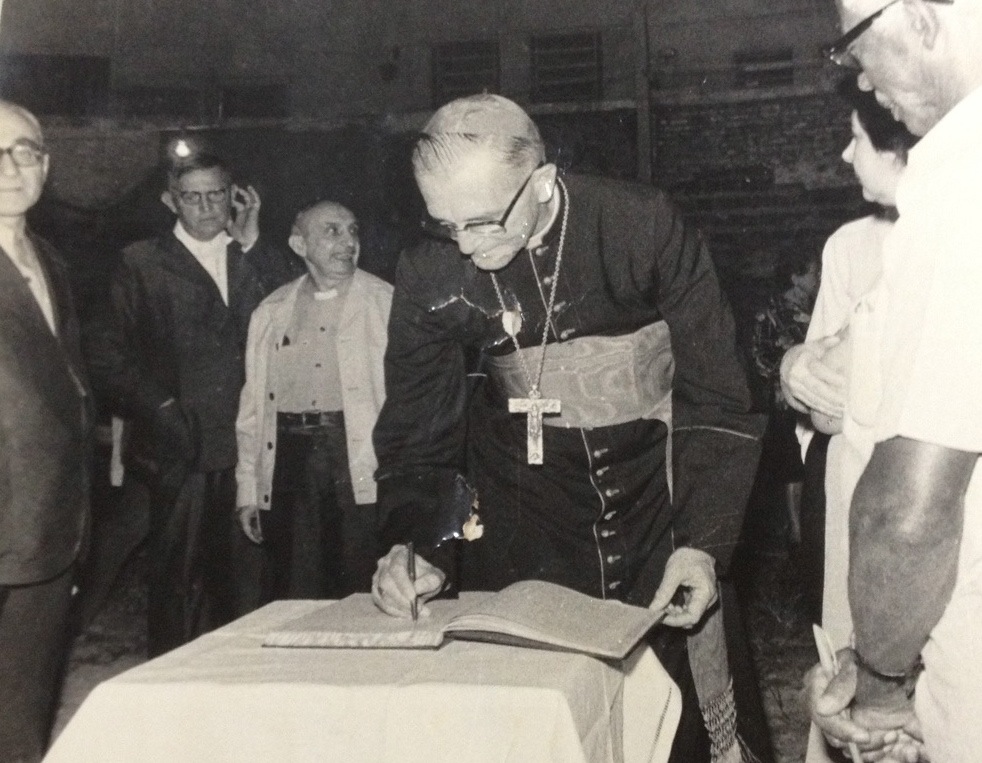 D. Eugenio sales assinando a Ata do Lançamento da Pedra Fundamental. Com: Pe. João Pattarelo (Provincial); Pe. Vitório Buzaterra; Pe. Antonio Pagliaro (todos da Congregação de D. Orione). Aparecem ainda moradores do bairro.